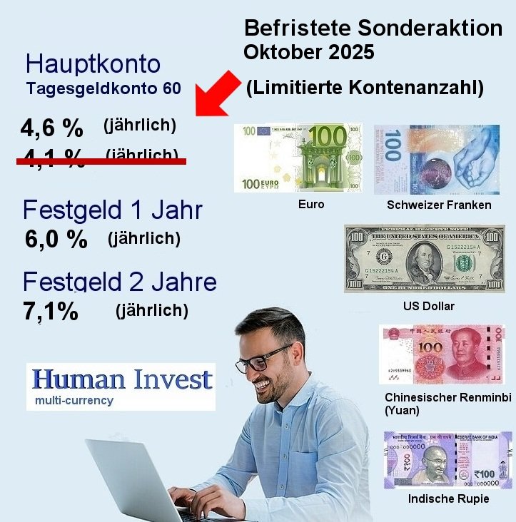 Einrichtungsbedingungen:Human Invest Konten sind internationale, sehr vertrauliche und sichere Anlagekonten mit hohen Renditen, keine Girokonten. Wie weltweit üblich, können von diesen Konten keine Überweisungen an Fremde (Dritte) erfolgen, noch von Fremden (Dritten) Zahlungen empfangen werden (Prävention von Geldwäsche). Die für die Namens-Zertifizierung des Kontoinhabers benötigte Grundeinlage beträgt mindestens 100 €/$. Diese ist nach vollständiger Kontoeröffnung und Bereitstellung zu leisten. ➥Siehe Zertifizierungs Verfahren. Es gibt bei Human Invest keine Einrichtungs- und Kontoführungsgebühren. So wird auch die Grundeinlage dem jeweiligen Konto gutgeschrieben und wie eine nomarle Einzahlung behandelt. Es finden bei Human Invest keine Überprüfungen bei Dritten (Identität, Bonität) statt, noch fordern wir jemals weitere Dokumente oder Unterlagen zum Identitätsnachweis an.